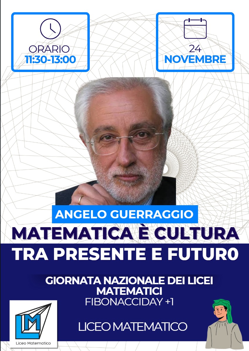 In occasione del Fibonacci Day (+1), il prossimo 24 novembre il gruppo UMI dei Licei Matematici propone la consueta iniziativa della Giornata dei Licei Matematici, un’occasione in cui moltissimi studenti e studentesse delle più diverse zone d’Italia si incontrano on-line per condividere lo spirito del Liceo Matematico.